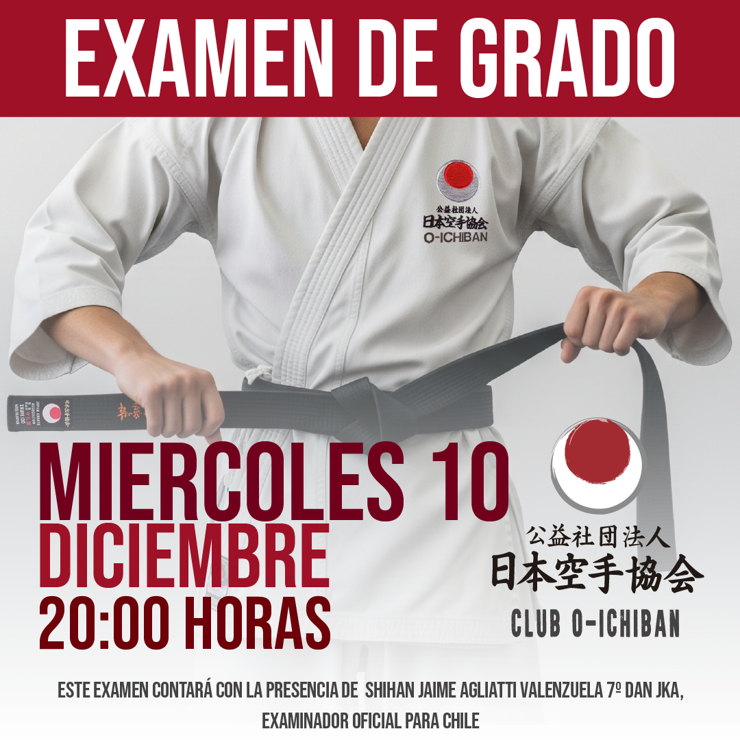 Se informa que el último examen de grado del año 2025 se llevará a cabo el miercoles 10 de diciembre a las 20:00 horas, en el Dojo O-Ichiban. Contaremos con la distinguida presencia de Shihan Jaime Agliatti Valenzuela, 7º Dan JKA, examinador oficial de la Japan Karate Association para Chile.
