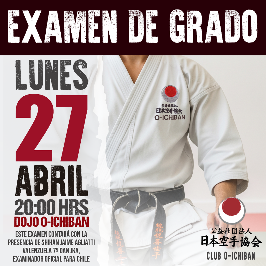 Se informa a nuestros alumnos y apoderados que el primer examen de grado del año 2026 se llevará a cabo el lunes 27 de abril a las 20:00 horas en el Dojo O-Ichiban. Para esta instancia, contaremos con la presencia de Shihan Jaime Agliatti Valenzuela (7º Dan JKA), examinador oficial de la Japan Karate Association para Chile.
