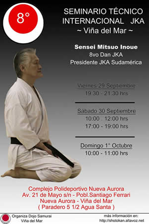 El Curso se llevará a efecto los días Viernes 29 , Sabado 30 de Septiembre y Domingo 01 de Octubre en Polideportivo Complejo Nueva Aurora Viña del Mar, y será dictado por Mitsuo Inoue 8° Dan JKA Senior Adviser JKA Chile. Esta jornada corresponde a la planificación anual de actividades organizadas por JKA Chile para el año 2017, dirigido a todos los practicantes del país. JKA Chile, señala la importancia que tiene la constante capacitación que deben tener los practicantes […]