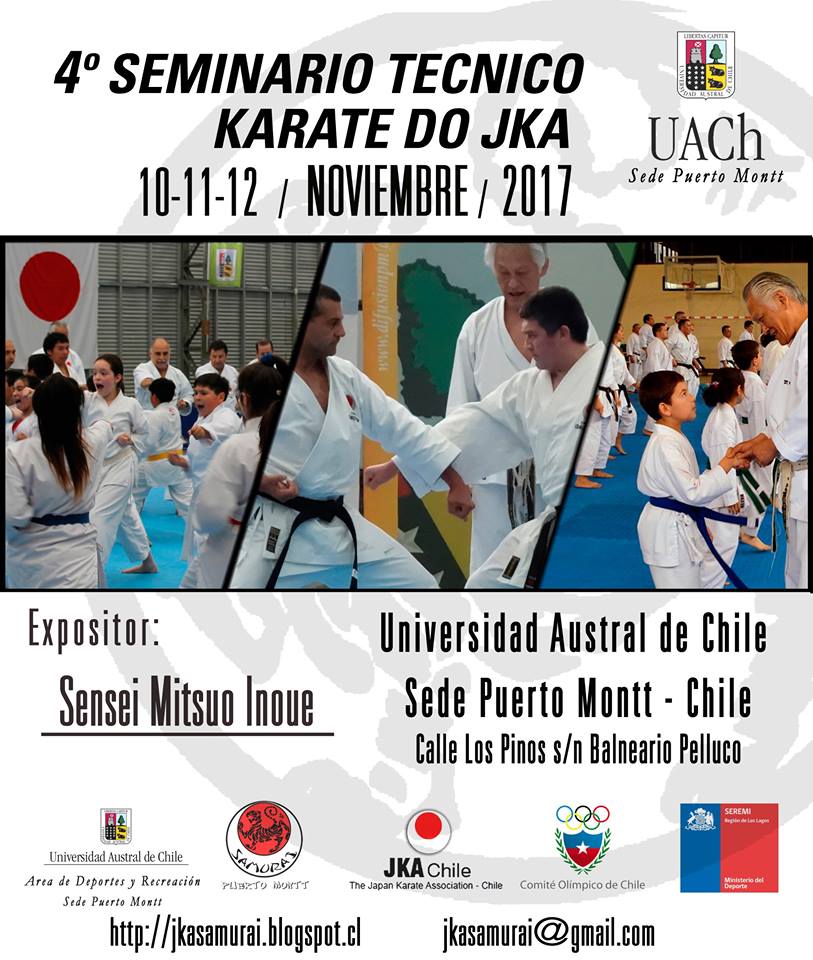 El Dojo Samurai JKA Puerto Montt y el Area de Deportes y Recreación de la sede Puerto Montt de la Universidad Austral de Chile, invitan cordialmente a participar del curso dirigido por Sensei MITSUO INOUE, 8° DAN de la Japan Karate Association – JKA. El Seminario se efectuara los días 10, 11 y 12 de Noviembre de 2017, en el Gimnasio de la Universidad Austral, Sede Puerto Montt, ubicado en el Sector de Pelluco. Valor Seminario: $25.000. Contacto para información […]