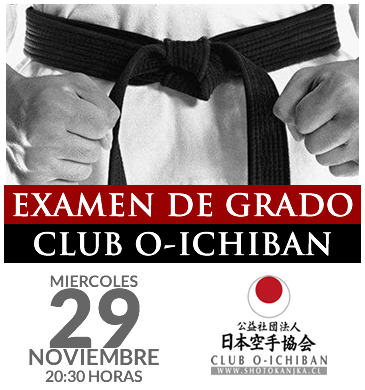 El último examen de grado correspondiente al año 2017, se efectuará el miércoles 29 de noviembre a las 20:30 horas, en el Dojo O-Ichiban. Este examen contará con la presencia del Sensei Jaime Agliatti Valenzuela 6º Dan JKA, examinador oficial para Chile. Los alumnos que cumplan con las condiciones podrán optar a rendir su examen, previa confirmación con Sensei Luis Arellano Requerimientos: – Tiempo mínimo en el grado – Pago de cuotas al día – Pago de mensualidades al día […]