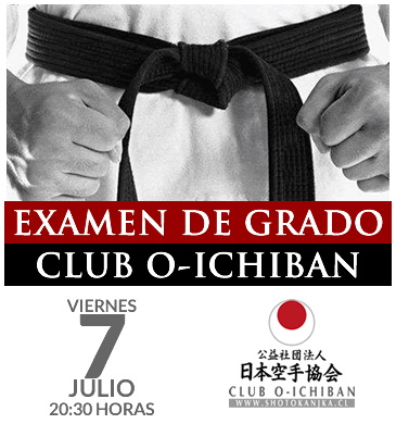 El segundo examen de grado correspondiente al año 2017, se efectuará el viernes 7 de julio a las 20:30 horas, en el Dojo O-Ichiban. Se contará con la presencia del Sensei Jaime Agliatti Valenzuela 6º Dan JKA, examinador oficial para Chile. Los alumnos que cumplan con las condiciones podrán optar a rendir su examen, previa confirmación con Sensei Luis Arellano Requerimientos: – Tiempo mínimo en el grado – Pago de cuotas al día – Pago de mensualidades al día – […]